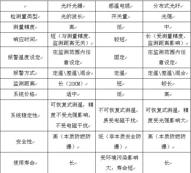 光纖光柵、感溫電纜、分布式光纖3種隧道火災(zāi)溫度類火災(zāi)探測技術(shù)對比如下: